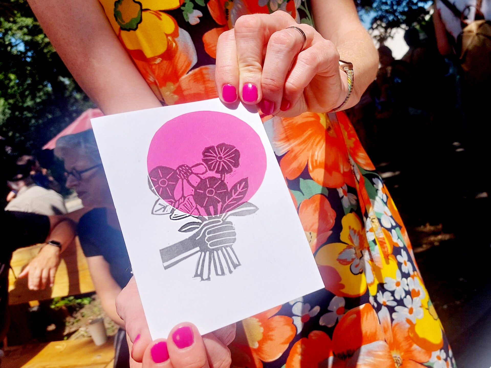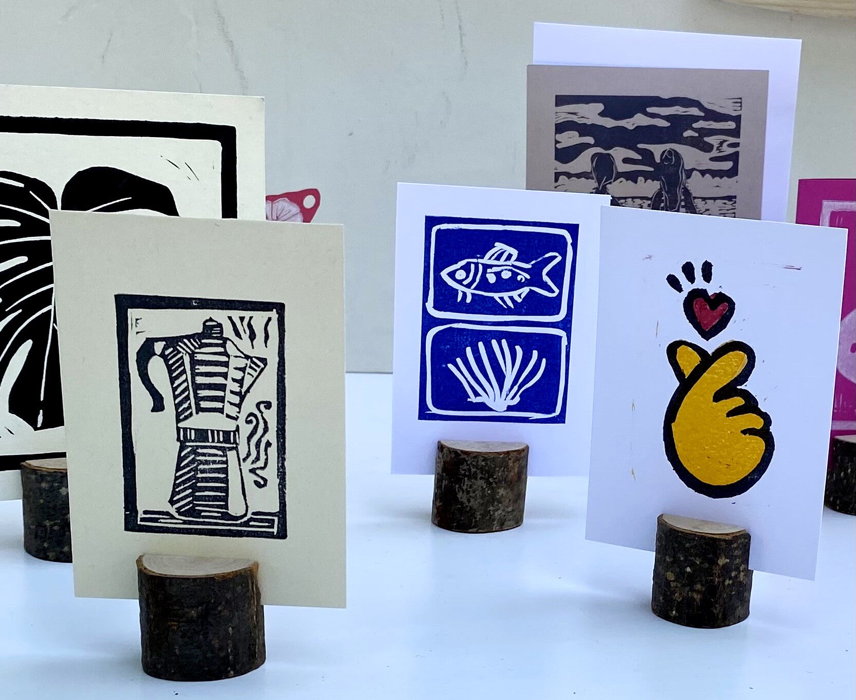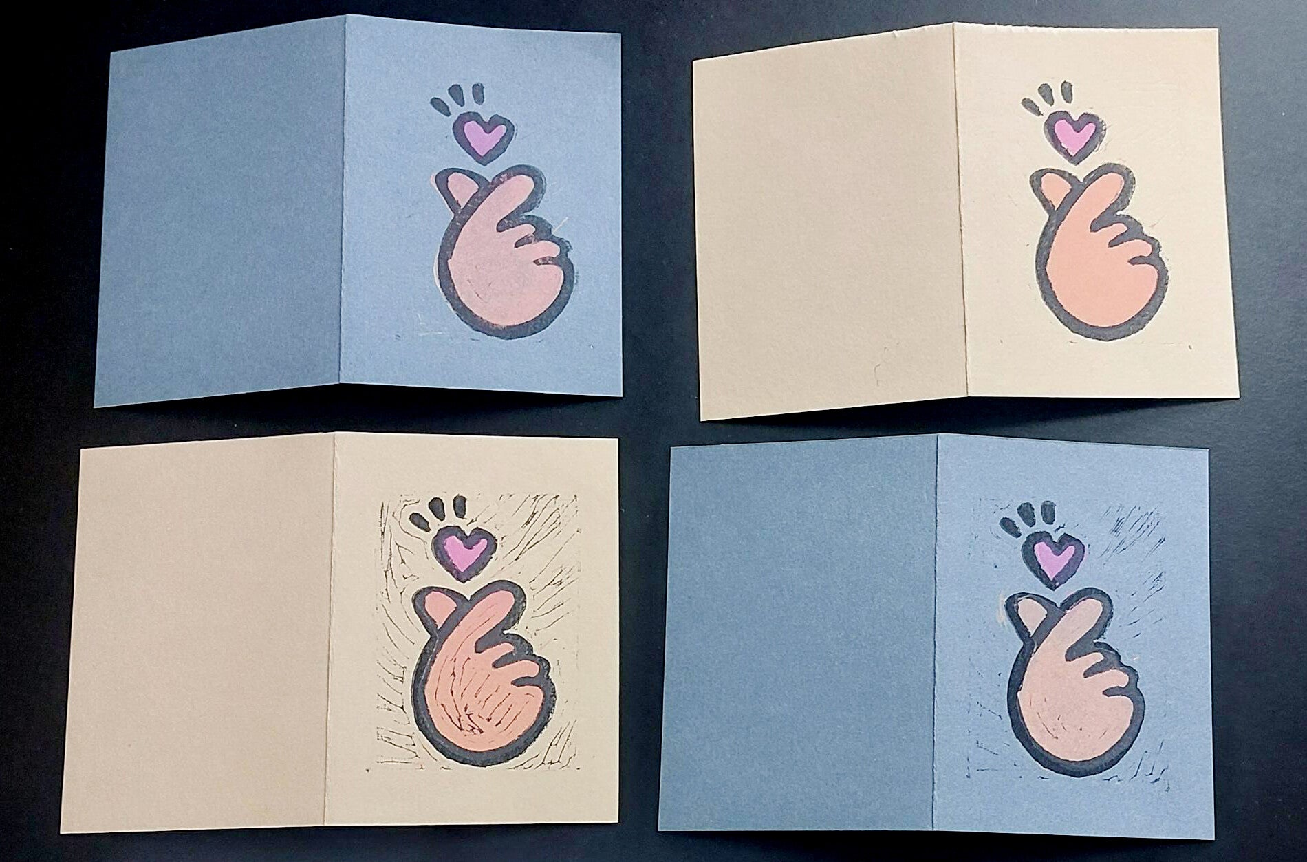 Ze gutsen (linoleum) & etsen (tetrapak) en maken zo hun eigen kaartjes.