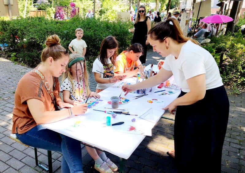Iryna geeft een workshop waarbij je kunt werken in de Oekraïense Petrykivka-schildertraditie.