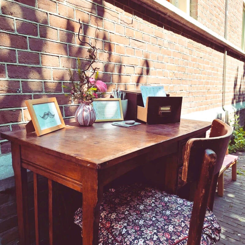 We nodigen je uit om te komen zitten en echt de tijd te nemen om een kaart te schrijven voor in de bak. Anderen schreven al prachtige kaarten over zichzelf, over kleine gelukjes en verlangens om iemand te ontmoeten.