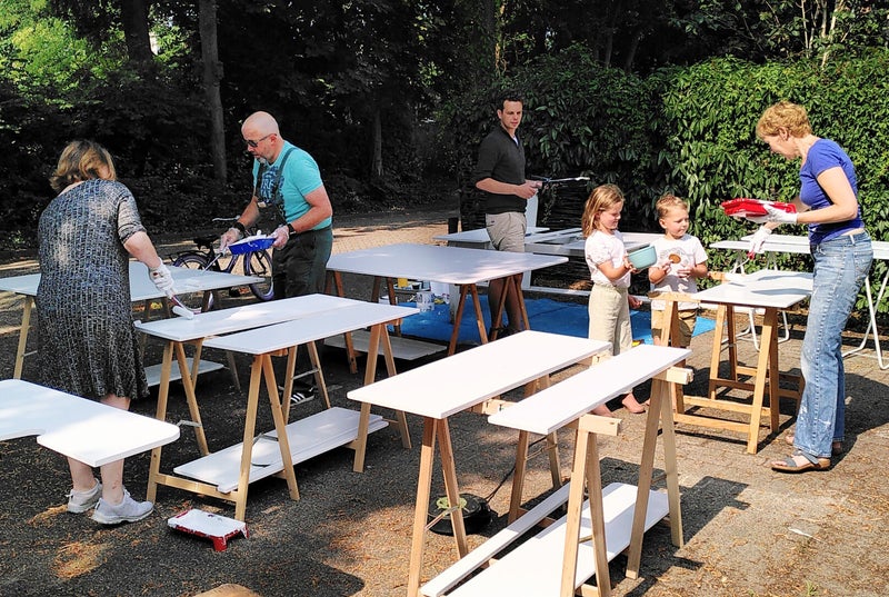Samen met vele buurtgenoten weren alle aparte onderdelen gezaagd, geschuurd en geschilderd.