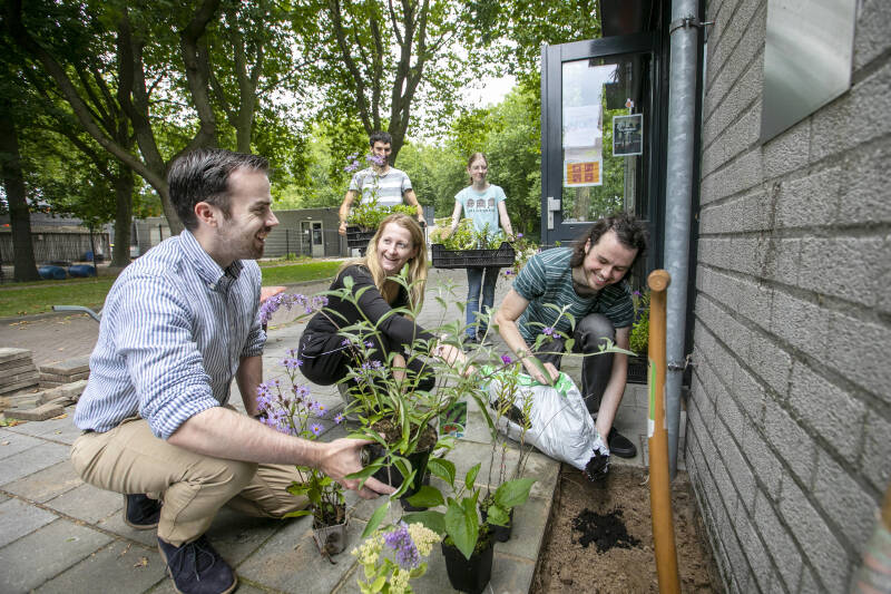 De Groene Plaatsmakers Den Bosch hebben zowel wijkbewoners van de wijk Sparrenburg in Rosmalen (gemeente Den Bosch) als het Jongerencentrum Number One geholpen met stenen en zand te scheppen, te sjouwen en met kruiwagens naar de container te brengen. De Gemeente 's-Hertogenbosch ondersteunde de actie met een gratis container, vlinderstruikjes voor alle deelnemers en zelfs met menskracht. Hulde voor Kees Boeren die keihard meegewerkt en gesjouwd heeft! Wethouder Mike van der Geld kwam ook langs, heeft een rondje door de wijk gelopen, sprak met een aantal buurtbewoners en de jongeren.
